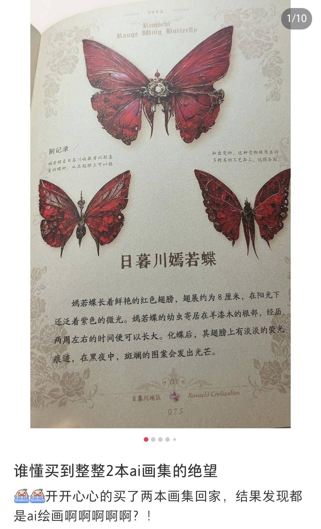 图书中的图片使用了AI辅助技术但是因为没有标注清楚,引起了消费者的不满,这样的情况已经不是第一次出现。最近,还有一本名为《蜉蝣解语》的绘本也被质疑为使用了AI辅助技术但是没有在电商平台清晰标注,一名读者在网上发帖表示,自己购买了画集后才发现里面的图片看起来不像是人手绘的,“找不到作者绘画的逻辑,没有活人味。”在中国国家版本馆对该书进行检索,在内容简介中可以看到“利用AI绘画工具辅助创作”的说明,对此这名读者表示了不满“如果是ai辅助绘画的我是不会购买的,为什么会删掉这么重要的说明?”记者也在电商平台检索到了这本书,图书介绍详情页中没有找到关于使用人工智能的说明,在消费者互动区中,也有消费者询问“这本书是不是Ai”,记者询问出版社店铺客服这本图书是否使用了AI辅助,客服表示这个没有写明。