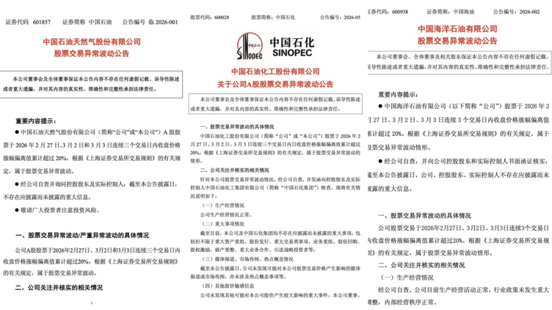 “三桶油”接连发布股票交易异常波动公告,大意是,公司在连续三个交易日,收盘价格涨幅偏离值累计超过了20%,但公司的生产经营活动正常,股票交易异常波动是由于地缘局势影响。