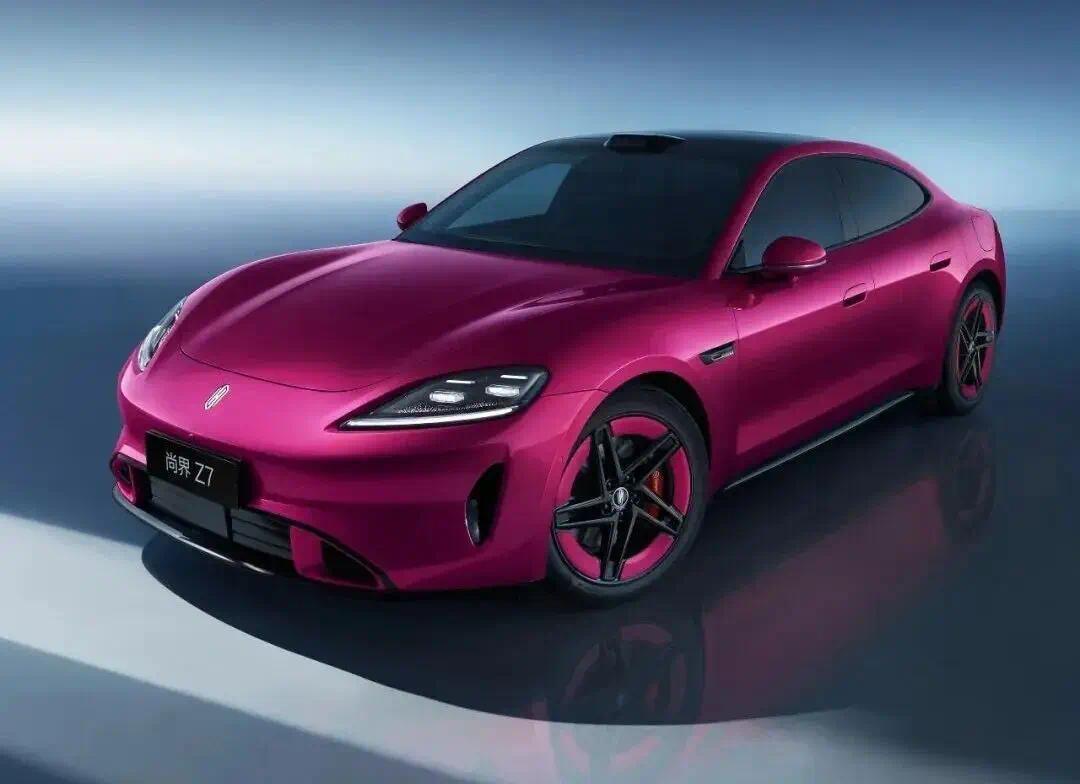 来看定位鸿蒙智行科技轿跑的尚界 Z7 电光紫粉配色,长这样: