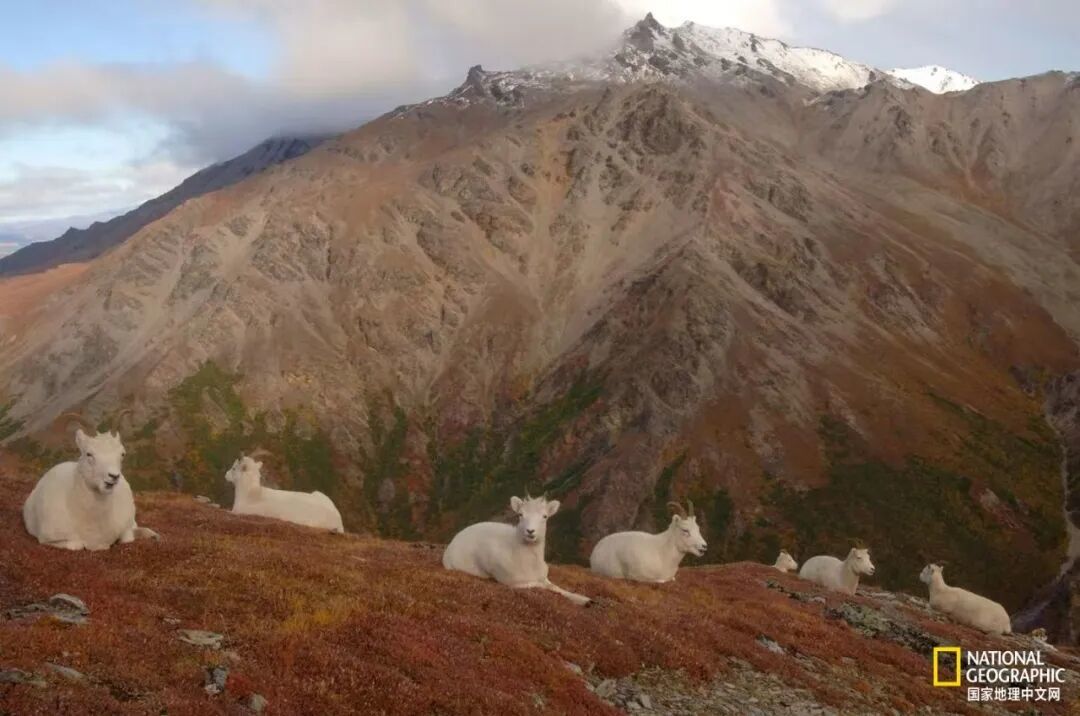 德纳里国家公园山坡上休憩的野大白羊(Dall sheep)群。