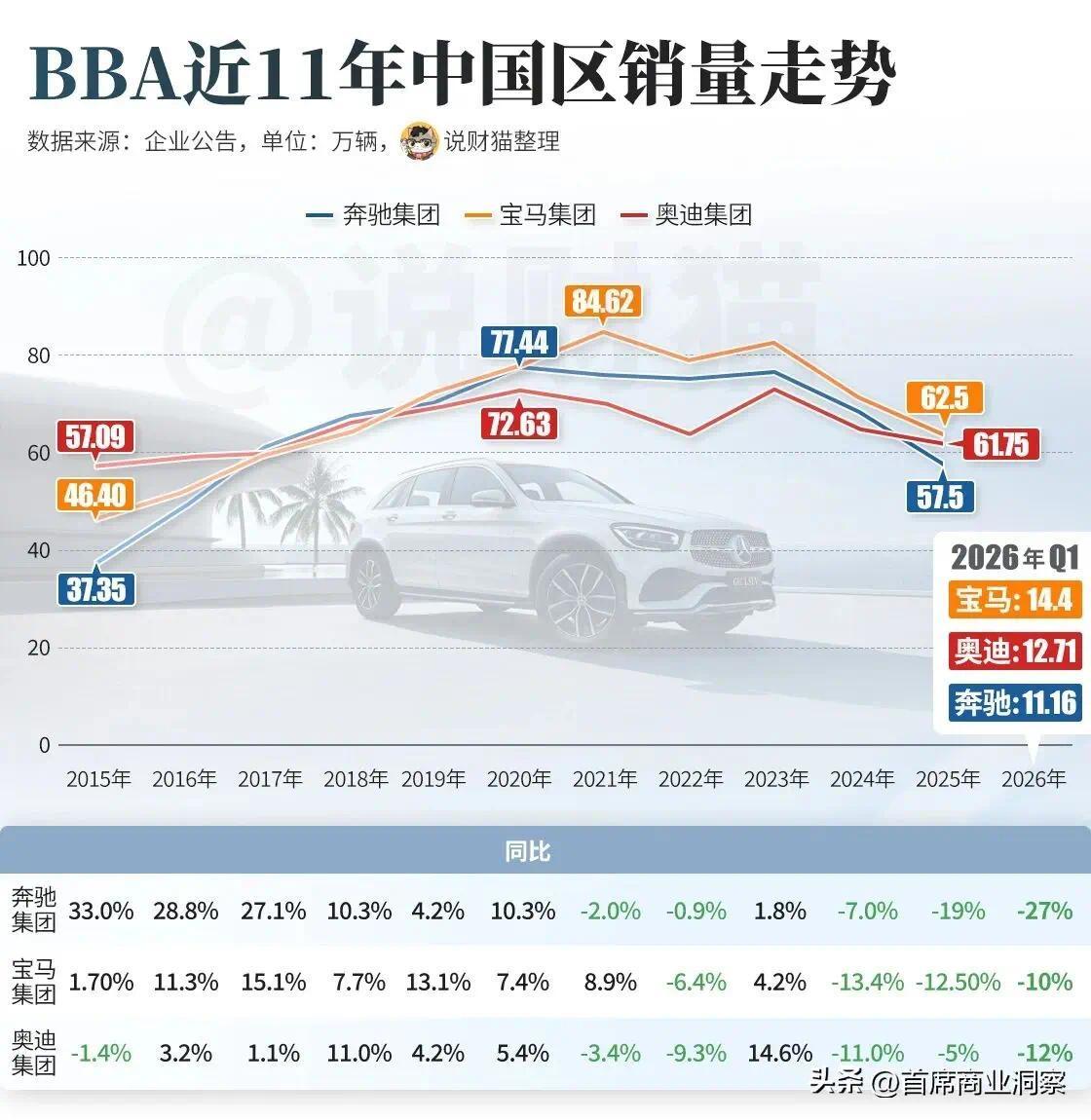 在2026年的1月到3月,奔驰一共在华销售了11.16万辆车,和2025年同期比较的话下滑了27%。