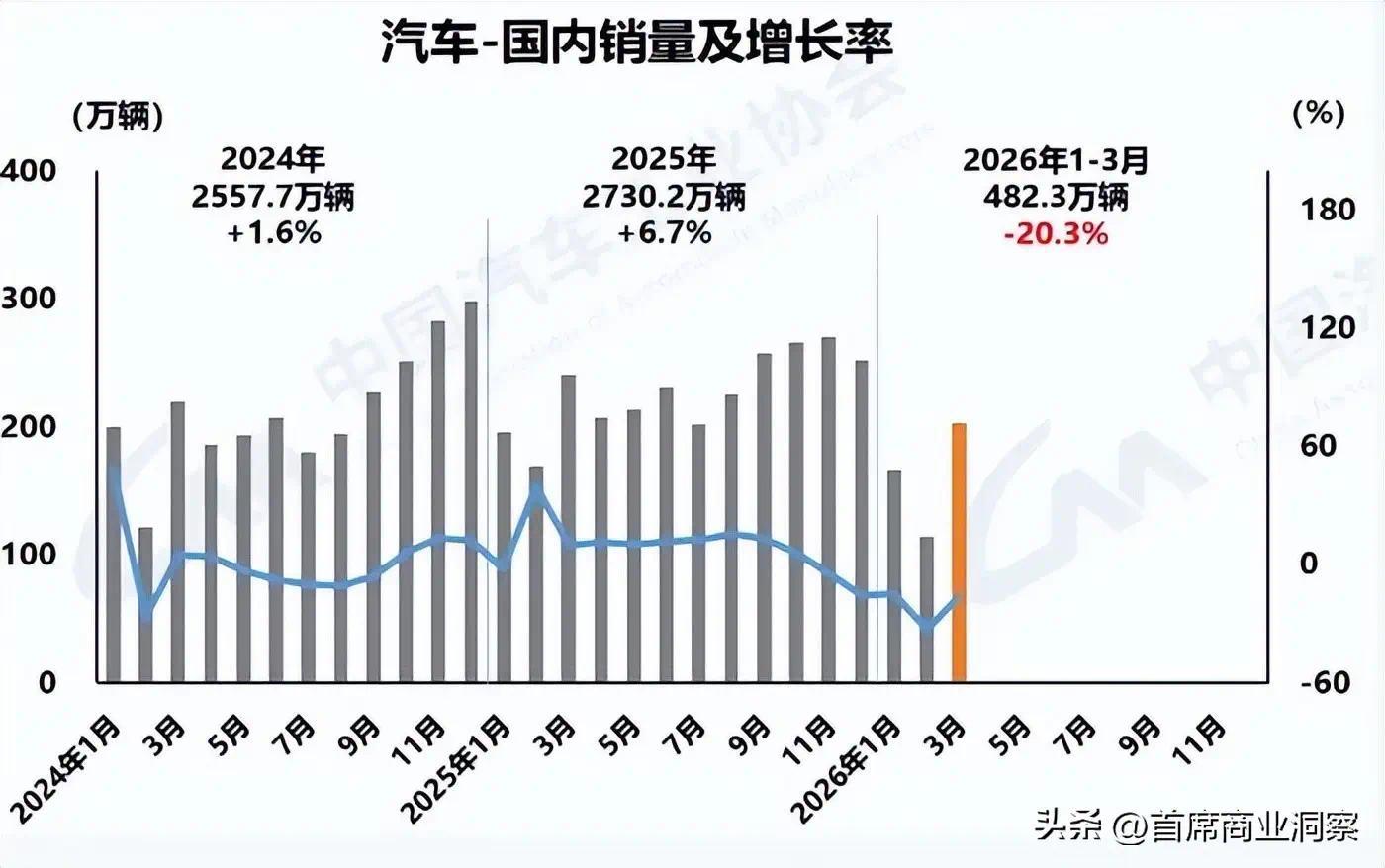 从相关数据来看,第一季度国内的汽车销量只有482.3万辆,和2025年同期相比的话下降了20.3%。