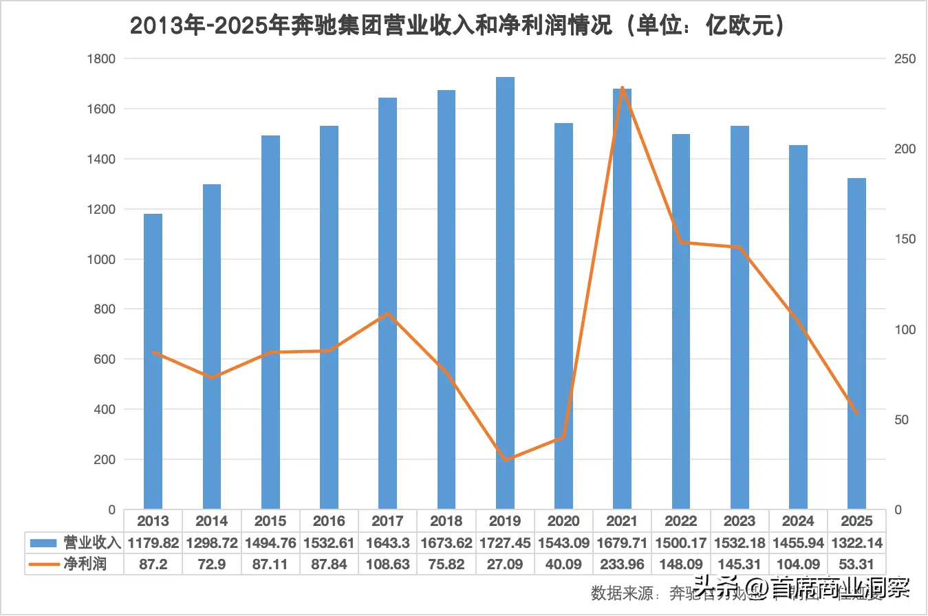 也正是在今年3月,奔驰也拿出了2025年财报,其全年的净利为53.31亿欧元,和前年同期相比的话降幅高达48.8%,相当于2025年比2024年少了400亿元的利润。